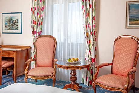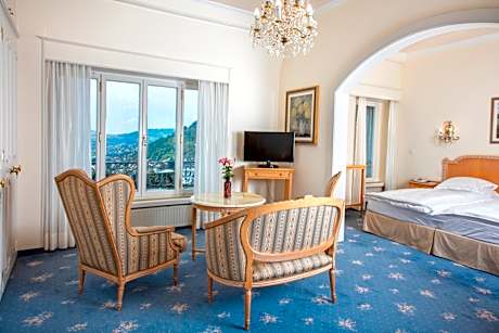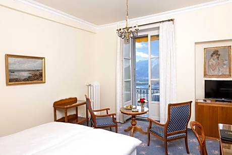 The majestic Victoria Hotel can be found in Glion above Montreux (connected by funicular) and is renowned for its breathtaking views of Lake Geneva and the snow-capped Alps. Discerning guests are offered a peaceful setting, an open-air swimming pool, personal service and upscale dining. The chef personally chooses the products from the market gardener, the fish shop, the local butcher and vineyard. The rich buffet breakfast is included in the room rate. Sitting on the shady terrace facing the lake and the Alps on a summer day is definitely a treat. Elegantly furnished and fully equipped rooms are perfect for a truly comfortable accommodations on this sunny plateau above Montreux. Wireless internet is available in the entire Victoria hotel free of charge. Your car can be parked for free on site.