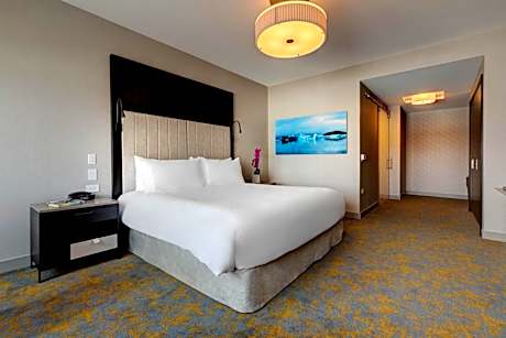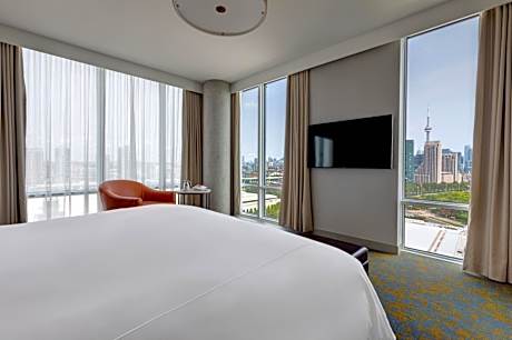 Hotel X Toronto, a Destination by Hyatt Hotel features waterfront and city skyline views. Located on the historic Exhibition grounds and 100% smoke free, Hotel X Toronto redefines the luxury hotel experience with exceptional rooftop hospitality, exquisite dining, flexible meeting spaces, extraordinary events and expansive tennis, fitness and wellness facilities. Amenities include exclusive theaters and a one-of-a-kind photographic art gallery. The Guerlain Spa, offers 10 unique treatment rooms, a beauty boutique with manicure and pedicure stations, and a post-treatment relaxation lounge overlooking the lake. Each elegantly designed guest room features free WiFi, free bottled water, a mini refrigerator and L'Occitane bath amenities. Hotel X Toronto's on-site restaurant, Roses Social is open for breakfast, lunch, and dinner. Our rooftop restaurant and bar Valerie is open for dinner. Within 0.9 mi from Hotel X Toronto at Exhibition Place, is the Enercare Center, Beanfield Center, Budweiser Stage, BMO Field, Ontario Place, Coca-Cola Coliseum, Queen Elizabeth Theater, Liberty Grand, and Medieval Times. The nearest airport is Billy Bishop Toronto City Airport, 1.4 mi away. Toronto's Liberty Village neighborhood is located 0.9 mi North of the Hotel, offering a variety of restaurants, bars, cafes, shops, and salons. King Street West is only 0.7 mi away and is another popular area for dining and shopping. Hotel X Toronto is 1.4 mi away from the iconic CN Tower, 1.6 mi from Toronto Symphony Orchestra, 1.7 mi from Ripley's Aquarium and 2.4 mi from the renowned Art Gallery of Ontario.