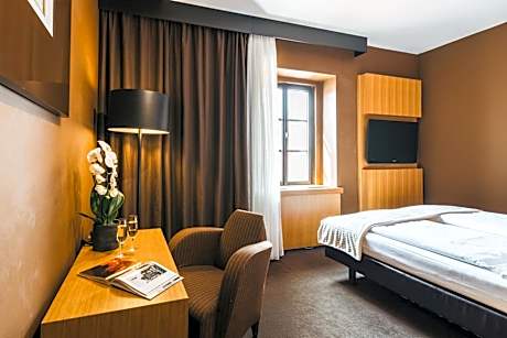 Located on the historic Main Square of the UNESCO-protected Cesky Krumlov, Hotel Zlaty Andel is a charming, originally Gothic building. It houses 2 restaurants and a café with homemade desserts. Pictures shown on the profile are some examples of 46 different rooms of the property. For further information about the room which will be assigned to you, please contact the reception.The property offers spacious rooms with satellite TV, seating areas and very large, tiled private bathrooms with showers and bathtubs. The restaurants Don Julius and Petr Vok have a traditional décor with wooden beams and serve a rich selection of Bohemian dishes and international specialties. The menu is accompanied by local Budweis beer and wines from Moravia and other regions. Guests can also dine al fresco on the terraces and enjoy the superb view over the Square and the castle of Cesky Krumlov. Free Wi-Fi is available in the public areas of the Zlaty Andel and in some of the rooms. The popular Music Cocktail and Dance Bar is located in the hotel’s historical vaulted cellar. Its drinks menu includes over 150 different cocktails, national wines and beers on tap.
