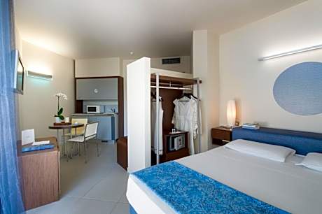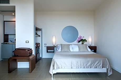 With its 1148 ft² wellness center, heated outdoor pool, charming gardens, and well-equipped private beach, Blu Suite Resort is ideal for a relaxing holiday in Bellaria Igea Marina. The private beach, open from Easter to September, is included with all room types and offers 1 beach umbrella and 1 sun lounger. Guests can also enjoy the sun by the pool, thanks to the loungers and umbrellas available. The pool features warm water and hydromassage areas. Children have access to a dedicated pool and an outdoor playground, as well as indoor playrooms, a beach playground, and a free kids’ club. A children’s restaurant with special menus is also available. Entertainment activities are organized from June to September. With unlimited access for guests aged 16 and over, the wellness center includes a sauna, gym, hot tub, Turkish bath, chromotherapy, and rooms for relaxing or Ayurvedic massages and beauty treatments. Economy rooms do not include access, but it is available for an additional fee. The wellness center is open daily from 10:00 to 20:00. All rooms are furnished in a modern style and feature flat-screen TVs with satellite channels and balconies. Suites offer larger balconies, while the Presidential Suite provides the ultimate luxury with indoor and outdoor hot tubs and a spacious terrace with sea views. All rooms and suites include a kitchenette, which can be used free of charge to warm up children’s meals. A generous breakfast is served daily, including organic and gluten-free products. Snacks can be enjoyed by the pool, and à la carte dinners are available. We offer three restaurants: a Mediterranean restaurant (Blue), a gourmet restaurant (Alma), and a beachside restaurant (Insolito Beach Café). The hotel is located 5 mi from the Rimini Exhibition Center and features two meeting rooms on site, with a maximum capacity of 150 people. Paid parking is available on site at €15.00 per day, and a garage (underground parking) is available at €20.00 per day, with reservation required. Bicycle rental is available on site. Pets are welcome, with a maximum weight of 20 kg, at a cost of €20.00 per day. Blu Suite Resort is also a wedding venue. We are the ideal location to say “I do” by the sea — as a legally recognized municipal venue. License Number(s): IT099001A1KENCZMQ7