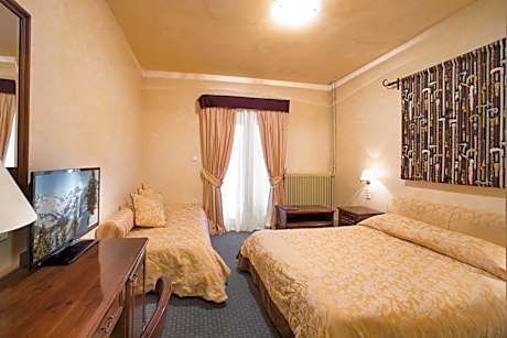 A comfortable room with elegant decoration suitable for three adults or a family. This type of room is the best choice for the accommodations of a family with two young children or infants, since there is also enough space for a baby cot which is provided upon request. Room size: 30 sqm. 1 double bed and 1 twin bed.