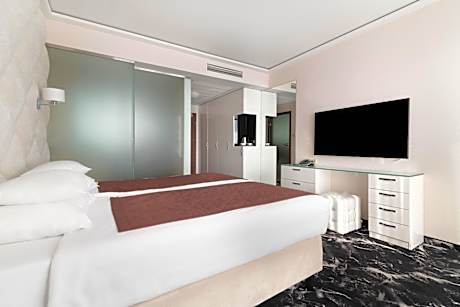 A modern, air-conditioned room with a flat-screen TV and panoramic windows offering a view of the forest and meadows or the distant city.