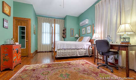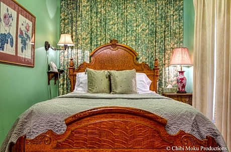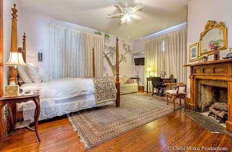Featuring a mural of a wisteria tree, this queen room is located on level 2 and includes a fireplace and private bathroom with walk-in shower.