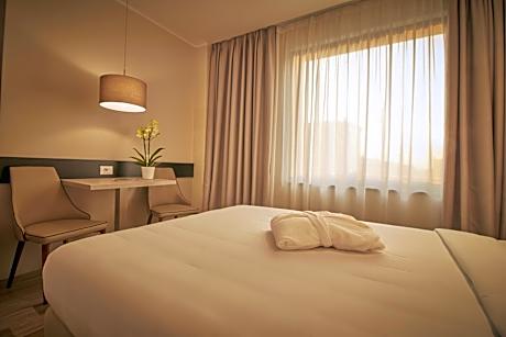 iH Hotels Milano Lorenteggio is a modern and welcoming 4-star hotel located in a quiet area to the west of Milan, ideal for families, groups, and anyone seeking relaxation during their stay in the city. The hotel offers a 24-hour reception, underground parking, an outdoor swimming pool with sun terrace and pool bar, a lounge bar, a meeting room, and a restaurant open for lunch and dinner serving Italian and Milanese specialties. Every morning, guests can enjoy a generous international buffet breakfast, with options also available for vegans and guests with gluten intolerance. The hotel is accessible to guests with reduced mobility. The rooms are spacious and functional, featuring free Wi-Fi, air conditioning, a safe, mini-bar, TV, and a private bathroom with a bath or shower. Designed to ensure comfort and practicality, they are suitable for all types of guests, from families to solo travelers. Located in a peaceful area west of Milan, the hotel is well connected to the city center and the main commercial and business districts, making it a convenient choice for both business and leisure stays. License Number(s): 015146-ALB-00032, IT
