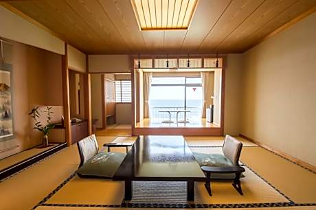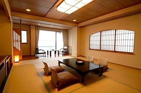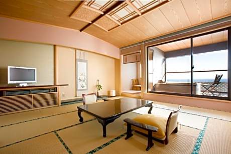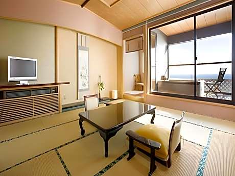 The private open-air bath is a top feature of this quadruple room. The quadruple room includes a private bathroom, well-fitted with a bath, a shower, a bidet, a hairdryer and slippers. The air-conditioned quadruple room features a flat-screen TV, tatami, a safe deposit box, an electric kettle as well as sea views. The unit has 4 futons.