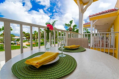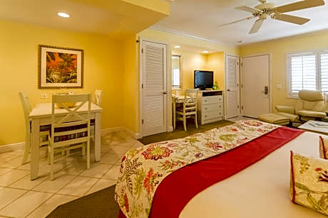 - Spacious studios equipped with full kitchens, dining tables for four, and cozy patios for private outdoor relaxation