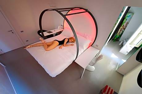 The bed is located in a giant cube, illuminated by a programable led RGB with changing colors.