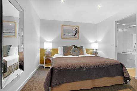 This 2-story loft-style apartment features a fully equipped kitchen and a spacious living area opening out to a patio with a large barbecue. The upstairs level features a bedroom with a private balcony with sun lounges. The private bathroom has an additional private balcony with views of Bancroft Bay.