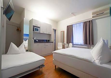 This is a large room with 2 single beds and 1 double sofa bed plus a fully equipped kitchen. It enjoys a quiet location on the backside of the hotel.
