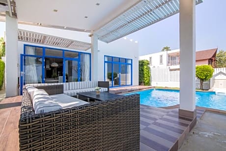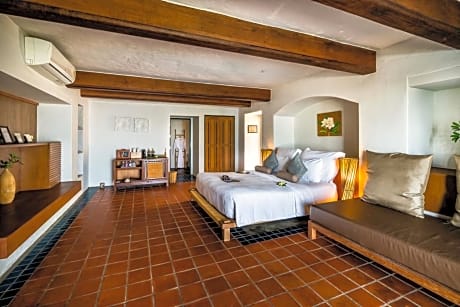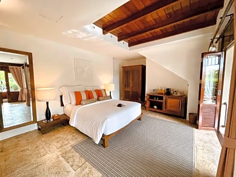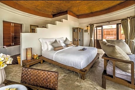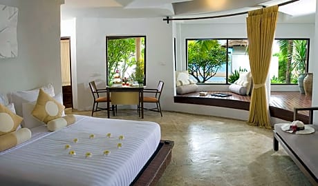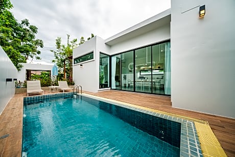 2BR Hidden Gem Garden Pool Villa is 1991 square feet and includes a king-size bed 150-183 width plus living room, balcony, and desk.
