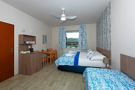 The pool with a view is a top feature of this quadruple room. Featuring free toiletries, this quadruple room includes a private bathroom with a shower and a hairdryer. The quadruple room is furnished with a desk and a seating area and features a tea and coffee maker, a wardrobe and garden views. The unit has 3 beds.