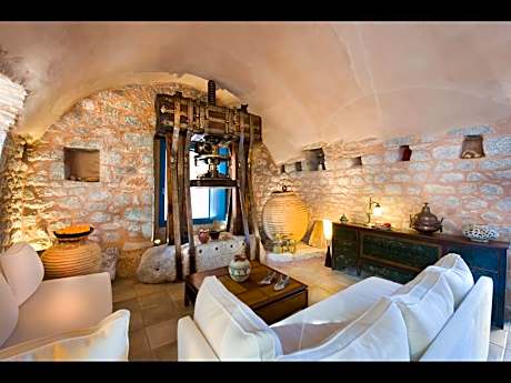 This traditional windmill is built in the traditional architectural style of Mani. Features large terrace with garden and views to the towers. Includes a seating area with a fireplace and decorated with artifacts, a bedroom and a loft.