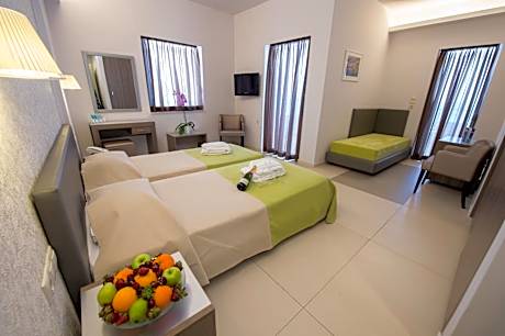 Astron Hotel is right at the water’s edge, with a view of the enchanting bay of Ierapetra. It offers rooms with 26’’ LCD TVs, WiFi and panoramic sea or mountain views. Each of the luxurious rooms at Astron feature soundproof windows and hypoallergenic mattresses and pillows. The bathrooms have non-slip tiles. The hotel’s 24-hour reception offers high quality services including transportation to and from Ierapetra and organization of day trips. Laptops are available and provided upon request. Free foreign and Greek press is also available at the hotel lounge. The hotel is conveniently located directly next to Ierapetra’s outdoor stadium where guests can freely jog or engage in group sports such as basketball or football. Iridanos Coffee Bar serves freshly ground coffee and homemade snacks. Guests can enjoy a hearty, certified Greek breakfast at the Phenix Restaurant that uses fresh Cretan ingredients produced locally or by the owners. License Number(s): 1040K013A0059000