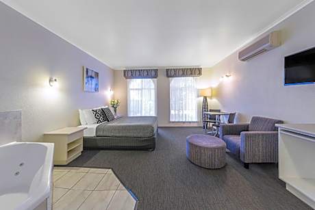 Conveniently located within walking distance to the Arts precinct and downtown Bendigo is the Cathedral Motor Inn offering an array of accommodations options for leisure and corporate guests alike. With the exception of our King Spa suites, all rooms boast a queen size bed with many of them also offering a single bed. We have 2 Family Suites which comfortably sleep up to 5 guests. All of our rooms boast a reverse cycle split system airconditioner, flat screen TV, private bathroom, toaster, kettle and microwave, along with basic crockery and cutlery all designed to make your stay as pleasant as can be. Our Reception hours are 8:00am through 7:00pm with friendly and knowledgeable staff,happy to help with your inquiries. The complex has ample off-street parking, free wi-fi, a free of charge guest laundry and a lovely barbecue area. Our Deluxe rooms overlook the lovely Wattle Park and the stunning Sacred Heart Cathedral.