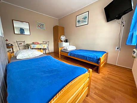 The triple room provides heating, as well as a shared bathroom featuring a shower. This triple room features a wardrobe, a carpeted floor, TV with cable channels, as well as chocolate for guests. The unit offers 3 beds.