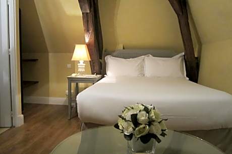 This spacious, room with attached bathroom is located on the top floor of the building and some of the rooms have exposed wooden beams.