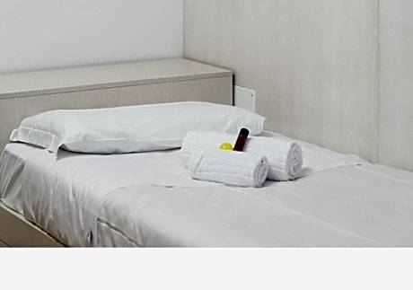 Bed in a twin room within an apartment with shared bathroom, living and kitchenette. Bed linen and towels included. Air conditioning, Wi-Fi in communal areas, reception 24/7.