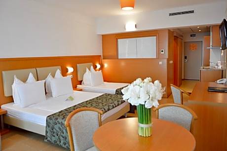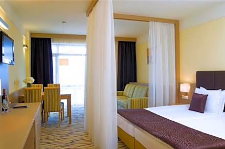Flamingo Grand Hotel & Spa is located in the central part of Albena and offers an indoor pool and an outdoor pool with a mini splash park for children. The property has a private beach area, and a sunshade and 2 sun beds are included in the room rate. Guests can enjoy a variety of meals at the main restaurant or drinks at the wine bar and piano bar. There are also a bistro and a night club at the property. All studios and suites feature a balcony, a flat-screen cable TV, air conditioning, a safety deposit box, a seating area, a desk and a mini-bar. The bathrooms are equipped with a bath or a shower, a hairdryer and free toiletries. Flamingo Grand Hotel & Spa also has a spa and wellness center Elements Spa and has a direct covered bridge connection to Medika spa center in hotel Dobrudja. Free WiFi is available in all areas. A beauty shop and a gift shop are also available, as well as a business center. At the property guests can enjoy a variety of sports, including tennis, mini golf, basketball, golf simulator, billiards, table tennis and horse riding. Water sports as windsurfing and diving are also available. Flamingo Grand Hotel & Spa is located next to numerous shops and 25 mi away from Varna Airport. Car hire can be arranged for guests. License Number(s): Б1-ЖДИ-1ЕД-А1