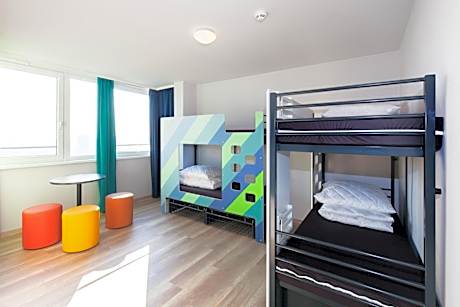 Functionally furnished room with a TV, consisting of 2 interconnected bedrooms and a private bathroom with a shower. Some rooms offer views of the city. For the bunk beds bed linen is provided for self-covering.
