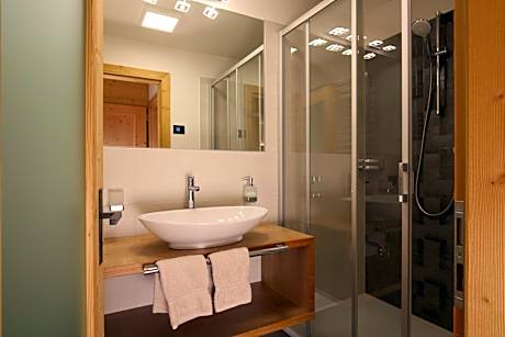 Room with wooden furniture, a TV and a private bathroom with a shower or a bath tub. Some have a balcony and views of the Valle di Marebbe valley.