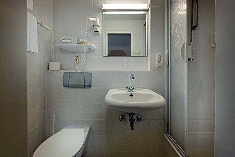 Simply furnished room with a satellite TV and private bathroom with a hairdryer.