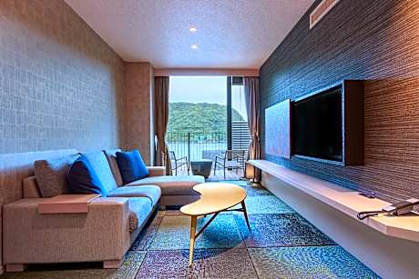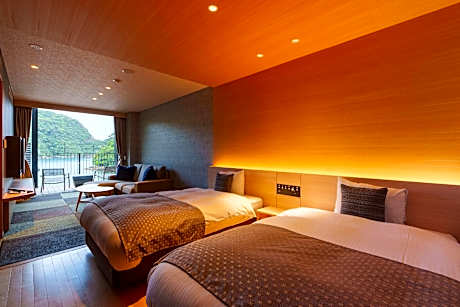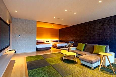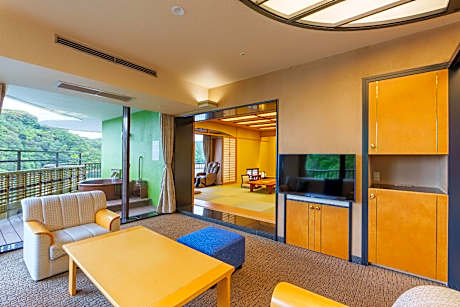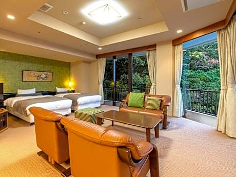 This quadruple room's special feature is the private open-air bath. The quadruple room offers air conditioning, tatami, a terrace with sea views as well as a private bathroom featuring a bath. The unit offers 2 beds and 2 futons.