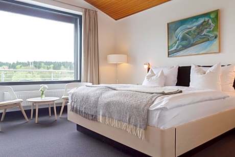 This hotel is in an idyllic location next to the spa gardens and Kranichsee lake in the historic town of Goslar, in the Harz mountains. The Hotel Njord provides modern, Nordic-style accommodations for hikers, cyclists and vacationers in the Goslar area. You can go hiking in the Harz nature park, or visit UNESCO World Heritage Sites such as Goslar’s Old Town and the Rummelsberg mines. Here in the Hotel Njord you can browse through the books in the library overlooking the lake, or unwind in the bar, by the fireplace in the lounge or in the game room. Pamper yourself in the spa area which features saunas, Hot tubs, massages and beauty treatments. Enjoy breakfast, an afternoon snack and dinner in the hotel restaurant. The delicious cuisine is prepared from fresh, local, organic produce. You can choose from a selection of wines from Germany or abroad. Guests staying in the Hotel Njord enjoy complimentary wireless internet access and free parking.