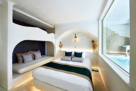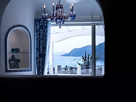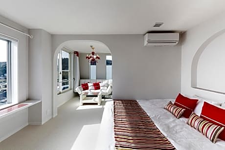 Features ocean views, a seating area and a spa bath. The decor features pastel colors, a white sofa and wide windows. Amenities include an LCD TV, a fridge and toiletries. Free Wi-Fi is provided.
