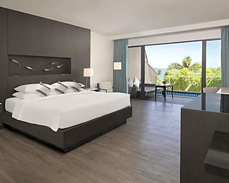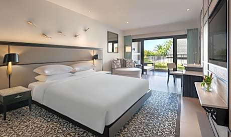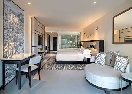 Spread out in a spacious 67-square-yard space, this room features one king-size bed with an additional room with a bunk bed, perfect for a family. The two rooms share a bathroom with a separate bathtub and walk-in shower, chaise, and work desk with views of tropical gardens.