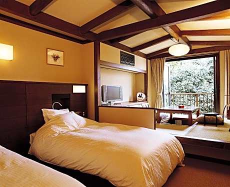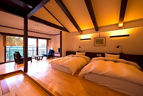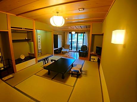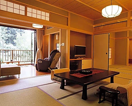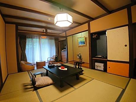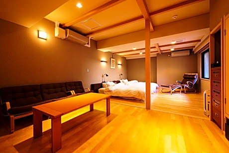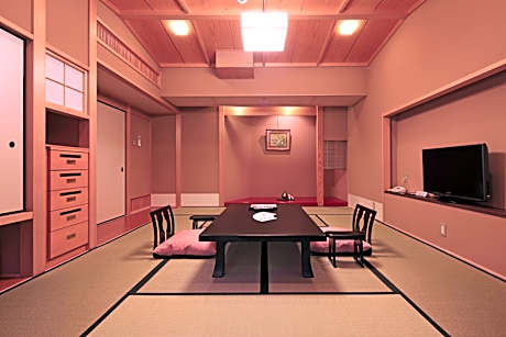 The spacious quadruple room provides air conditioning, tatami, as well as a private bathroom featuring a bath and a shower. The quadruple room offers a seating area, a safe deposit box, an electric kettle, yukata and a flat-screen TV. The unit offers 4 futons.