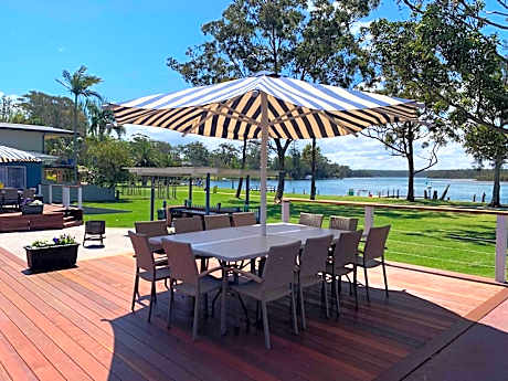 Laguna lodge Group Accommodations offers a large river frontage with views up the inlet to St. Georges basin. All units are only yards from our private jetty & moorings. Jervis Bay Village is 6.8 mi from the property. Free private parking and free WiFi is available on site. There is a bike track is directly in front of the property, so guests can enjoy a stroll or bike ride around the local area. Guests can also enjoy the new heated outdoor swimming pool. Laguna lodge Group Accommodations is within walking distance of the village with all town facilities, club, restaurants, picture theater, grocery store. The 2 Luxury spacious 2 bedroom pool side units are fully equipped with a stylish modern kitchen, including oven, grill, microwave, full size fridge with an additional commercial bar fridge. Rooms with high raked ceilings contain a built in wardrobe with hanging space and shelves. The modern bathroom includes a toilet, vanity and large glass sliding door shower big enough for 2 to shower in. The open plan kitchen flows out into the dining and lounge room creating a relaxed yet social feel. The 6 uniquely designed 2 bedroom & self contained water front units all wrap around the great large deck which flows onto the covered communal BBQ area which overlooks the tranquility of the inlet and our private jetty.