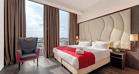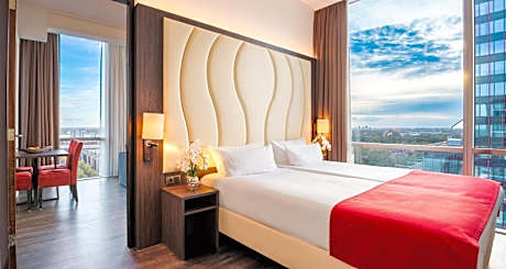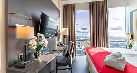 Il PLAZA Premium Almere sorge nel cuore commerciale di Almere, accanto al World Trade Center. Questo moderno hotel offre una reception aperta 24 ore su 24, un deposito bagagli e la connessione WiFi gratuita. Il parcheggio in loco è disponibile a un costo aggiuntivo. Tutte le camere dell'hotel sono dotate di aria condizionata, letti confortevoli, scrivania, set per la preparazione di tè e caffè e TV a schermo piatto. Il bagno privato è completo di asciugacapelli, set di cortesia e doccia con getto a pioggia. I monolocali e gli appartamenti con angolo cottura sono ideali per soggiorni prolungati. Il PLAZA Premium Almere ospita un ristorante dove viene servita ogni mattina una colazione continentale. Potrete sorseggiare un drink al bar dell'hotel o visitare il ristorante Loetje Almere. Grazie alla sua posizione centrale, proprio nel centro città, il PLAZA Premium Almere è circondato da una vivace scena culturale, artistica e commerciale. Di fronte all'hotel si trova una stazione degli autobus e dei treni. Amsterdam dista 35 km dall'hotel, mentre Utrecht 43 km. L'aeroporto più vicino è quello di Schiphol, a 47 km dal PLAZA Premium Almere.