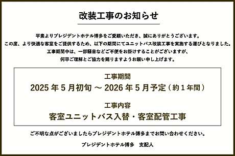 Experience an abundance of unparalleled facilities and features at President Hotel Hakata.Maintain seamless communication using the complimentary Wi-Fi at hotel.Discovering Fukuoka becomes even more accessible, thanks to the shuttle amenities provided at the hotel.Guests can avail parking facilities at the hotel. During your stay at this fantastic hotel, the attentive front desk personnel can provide you with a range of amenities such as luggage storage and safety deposit boxes. At the hotel, utilize the on-site dry cleaning service and laundry service to maintain your beloved travel attire fresh, allowing you to bring fewer clothes. During leisurely days and evenings, on-site amenities such as daily housekeeping enable you to fully enjoy your accommodation.At President Hotel Hakata, every guestroom is provided with convenient amenities and fittings to ensure a comfortable stay.Enhance your experience at hotel with the knowledge that certain rooms are equipped with linen service, blackout curtains and air conditioning for your convenience.Certain rooms boast in-room amusement features such as daily newspaper, television, in-room video streaming and cable TV, offering guests an enjoyable stay. In select rooms within the hotel, a refrigerator, bottled water, instant coffee and instant tea is available to cater to your requirements when desired.It is worth noting that certain guest bathrooms feature a hair dryer and toiletries for your convenience. At the hotel, an assortment of easily accessible and delicious meal choices are available to satisfy your appetite whenever it strikes. At President Hotel Hakata, guests can access vending machines that provide light snacks and beverages 24 hours a day.