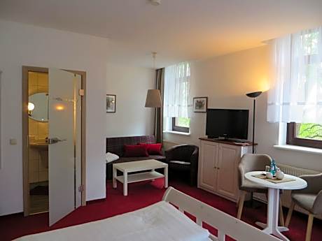 South-facing rooms with great views of the Steigerwald Forest are offered by the family-run Rhodaer Grund. The hotel enjoys a peaceful, green location, 3.1 mi from Erfurt city center. Guests stay in spacious, nonsmoking rooms or apartments with satellite TV. A modern bathroom with toiletries and a hairdryer is providedin each room. Apartment guests also have their own fully equipped kitchen. International and German cuisine is served in the Rhodaer Grund’s rustic-style restaurant, which also features a breakfast buffets. In warm weather, guests can eat on the pretty terrace. Additional dining opportunities are 1312 feet away. The Rhodaer Grund Hotel is 10 minutes from the A4 motorway, 15 minutes from the Erfurt Exhibition Center, 25 minutes from Weimar, 35 minutes from Eisenach and 45 minutes from Oberhof. Public transport is also available next to the hotel. The surrounding countryside is ideal for hiking and cycling.