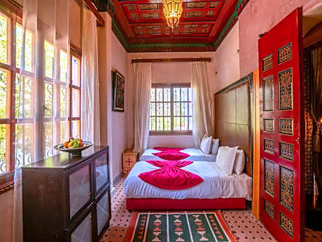 Decorated in a traditional Moroccan style, Riad Clé De Sol & SPA features an outdoor swimming pool, a garden, a hammam, a patio with a fountain, and free Wi-Fi throughout. It is 24 mi from Marrakech Airport. The rooms at Riad Clé De Sol & SPA have a flat-screen TV, a seating area, air-conditioning and individual heating. The private bathrooms include free toiletries, a bath tub or a shower and toilet. The restaurant serves traditional Moroccan cuisine and guests can enjoy their meals on the terrace looking onto the surrounding mountains. There is also a Moroccan lounge with a fireplace. Located 22 mi from Marrakech Train Station, Riad Clé De Sol & SPA can arrange activities, excursions, and camel and horse riding in the surrounding area. Massages are also available at an additional cost. License Number(s): 40000MH1982