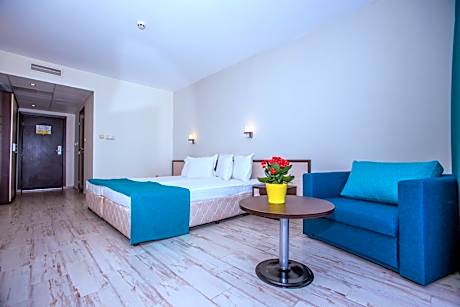 This impressive 4-star hotel is located near the southern center of Sunny Beach. It features 268 rooms on 10 floors and is about 656 feet away from the beach. Guests have free access to an outdoor pool and children have a playground at their disposal. At a surcharge, a spa center with a sauna, hot tub, solarium and massage is also available. WiFi is provided in public areas, at an extra fee. Parking is available at an additional charge. The next entertainment area is about 984 feet away and the hotel is also easily accessible by public transport with a bus stop just 66 feet away. You can choose from tastefully furnished rooms in modern style featuring up-to-date facilities and start your day at the rich complimentary breakfast buffet.