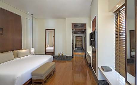 With neutral hued Asian style minimalism and Omani details, enjoy a space with high ceilings, oversize windows welcoming natural light, sitting area with built-in sofa bench, work desk and a Nespresso machine.