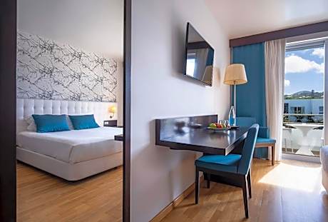 Featuring a private balcony and bathroom, this spacious room has brightly colored furnishings and bedding. It features a flat-screen TV, wooden floors and a seating area.