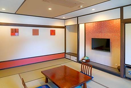 Room featuring a tatami (woven-straw) floor, a low table with seating cushions and traditional futon bedding. It comes with a seating area with chairs and a coffee table, a flat-screen TV and a fridge. Yukata robes and a personal safe are provided. The room is equipped with a private toilet. Please note that bathing facilities are shared.
