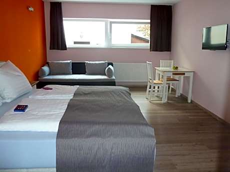 This spacious and elegant room features warm colors, box-spring beds with an extra box-spring couch, satellite TV, free WiFi, a table and a private bathroom with shower and WC.