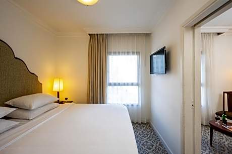 The Jerusalem Gold is an elegant hotel in the heart of the new city, next to the Central Bus Station and a 20-minute walk from the historic center. Rooms at the Jerusalem Gold come with extra-long beds, Mahogany furniture, black-out curtains, and double glazed windows for extra soundproofing. You can choose your pillow from a menu. Modern facilities include air conditioning, fridge, video games, and a laptop-size safe. The hotel is a stone's throw from the Jerusalem Convention Center, and the colorful Mahne Yehuda Market is within walking distance of the hotel. The city's major attractions, such as the Biblical Zoo, Time Elevator and Science Museum, are easily accessible by public transportation. There are numerous restaurants, shops and entertainment venues a short walk from the Gold Hotel.
