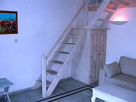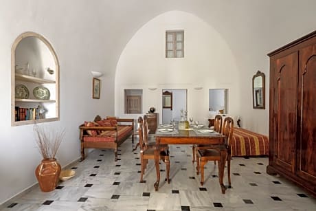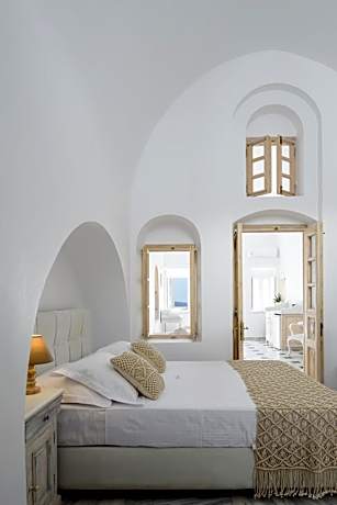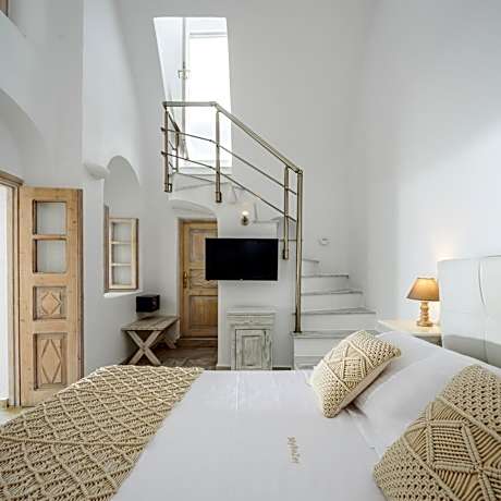 Overlooking the caldera and the pool. This two-story room has a sitting hall, bedroom on the loft with queen size bed, bathroom, showers and semi-private terrace.