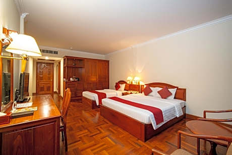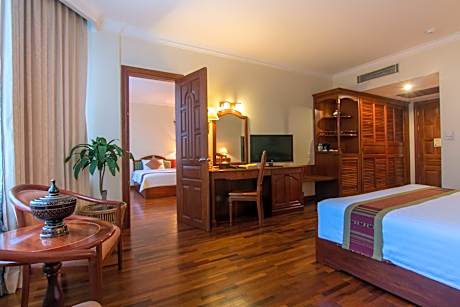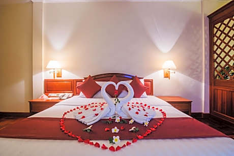 Great care is taken to ensure guests experience comfort through top-notch services and amenities. Remain linked during your visit by utilizing the complimentary internet access available. Discovering Siem Reap becomes even more accessible through the car hire and shuttle amenities provided at the hotel. The hotel offers complimentary parking for guests who arrive with their own mode of transport.Effortlessly plan your daily activities and travel requirements with concierge service, express check-in or check-out, luggage storage and safety deposit boxes provided by the front desk services. Securing passes to the city's top attractions is simple with the hotel's ticket service and tours. For extended visits or whenever required, the dry cleaning service and laundry service ensures your preferred travel garments remain clean and accessible.During leisurely days and evenings, in-room amenities such as 24-hour room service, room service and daily housekeeping enable you to maximize your stay in the room.For minor or impromptu requirements, the convenience stores can promptly cater to them without the necessity of stepping out from the hotel.The hotel is completely smoke-free.In limited designated zones, smoking is exclusively permitted. Crafted for coziness, every guestroom provides an array of features, guaranteeing a tranquil night's sleep while maintaining the level of comfort.For a more enjoyable stay, select rooms at hotel are equipped with linen service, blackout curtains and air conditioning.At Khemara Angkor Hotel & Spa, a selection of rooms can be found that showcase unique design elements such as a balcony or terrace.For certain chosen rooms, guests can enjoy in-room amusement like daily newspaper, television and cable TV as a part of their stay. Rest assured that your hydration needs will be met, as some guestrooms are equipped with a refrigerator, bottled water, a coffee or tea maker and mini bar. Khemara Angkor Hotel & Spa offers a hair dryer, toiletries and bathrobes in the restrooms of specific accommodations. Chosen accommodation prices might include entry to the executive lounge, offering premium services amid an ambiance of refined extravagance. Each morning at Khemara Angkor Hotel & Spa, a scrumptious, homemade breakfast kick-starts the day.Begin your holiday mornings right with your essential cup of coffee, offered daily at the cafe on-site. During your visit, indulge in a range of delightful culinary choices at hotel to enhance your experience.Enjoy an entertaining evening alongside your fellow travelers at hotel's very own karaoke rooms and bar. Do you possess exceptional culinary skills? Prepare your meals personally within the hotel at its BBQ facilities.Indulge in the numerous pursuits available at Khemara Angkor Hotel & Spa. Treat and spoil yourself by stopping at massage, hot tub, steam room, spa and sauna for a memorable experience. Begin your holiday perfectly by taking a plunge into the swimming pool. At the hotel, enjoy a laid-back beverage experience by the poolside bar, sipping on a soothing cocktail.Eliminate those holiday calories by stopping by hotel and making use of their well-equipped exercise amenities.