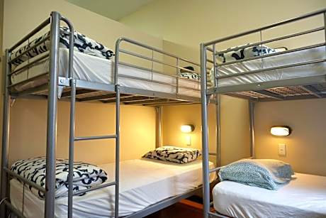 This room has a double-sized bed and a single-sized bunk bed on top. It includes access to shared bathroom facilities.
