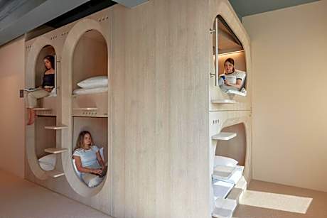Every capsule comes with a super single-size pocketed spring mattress, blackout roller blinds, power points and USB ports, folding desk and mirror.