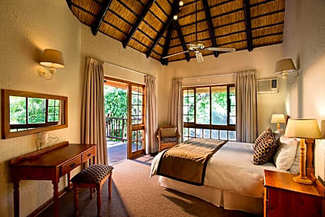 The Kruger Park Lodge Estate is located in Hazyview on the banks of the Sabie River. The resort has a 9-hole golf course, 3 swimming pools and offers air-conditioned guestrooms. Lodge rooms are located in chalets surrounded by mahogany trees and gardens. Rooms have thatched roofs and modern wood furnishings. They come equipped with a TV and have a balcony with panoramic views. Guests of Kruger Park can enjoy a game of tennis on one of the resort’s 4 courts, or relax on a sun lounger poolside. The Estate has trampolines and offers activities for children. Nearby leisure activities include bird and hippo watching. The Kruger Park Lodge Estate is a 20-minute drive from Kruger National Park and is 21 mi from Graskop. The resort offers 24-hour front desk service and free private on-site parking.