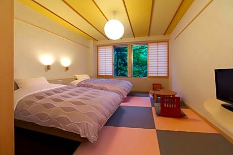 This twin room with an Asian resort-style decor features an electric kettle. Guests have access to the public bathroom facilities.