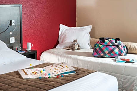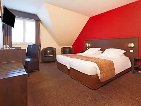 Kyriad Tours - Joué-Lès-Tours is set in a private park just 3.1 mi from Tours and 6.2 mi from the train station. It provides en suite accommodations, a tennis court in the Loire valley. The hotel also has a bar and a private lounge. Each room at the Kyriad Tours - Joué-Lès-Tours has a desk, free WiFi access and a TV with a cable sport channel. A buffet breakfast is served every morning. Local points of interest include castles like the Château Villandry (8.7 mi), the Château Azay-Le-Rideau (14 mi) and Chenonceau (24 mi). Guests can also sample famous Loire valley wines at Vouvray, which is 8.7 mi away. Free parking is available on site. La Gloriette Golf Course is a 5-minute drive from the hotel.