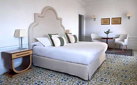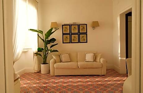 Air-conditioned room with hand-decorated Vietri tiles on the floors, classic furniture, and white walls.