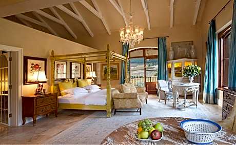 La Residence offers luxury accommodations in a tranquil setting on a private estate in Franschhoek. The hotel is surrounded by vineyards and spectacular mountain vistas. The suites at La Residence are individually decorated, combining old world charm and antiques with modern conveniences. Each suite is air-conditioned, offers a flat-screen satellite TV, and a mini bar. Guests can start their day with a scrumptious buffet breakfast and a hot breakfast menu. Light, seasonal lunches are offered during the day and dinner is served either at the Great Hall, the hotel's lavish dining area, our al-fresco on the Persian alley overlooking the lawns and mountains. For relaxation, the spa at La Residence offers beauty treatments and massages and guests can also work out in the fully equipped fitness center or enjoy a refreshing dip in the pool. The hotel offers its guests a free shuttle service to Franschhoek village and airport transfers can be arranged for a surcharge. Guests also benefit from free laundry services. The surrounding area is home to many award-winning restaurants and wine estates. The Huguenot Memorial Monument is 1.6 mi away and Stellenbosch can be reached within 30 minutes' drive.